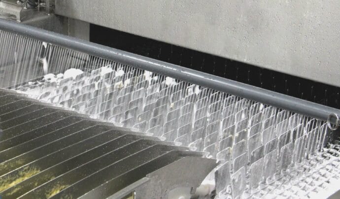 Full-width foam coverage for efficient conveyor belt cleaning in food processing environments.