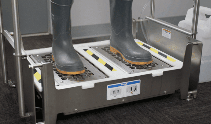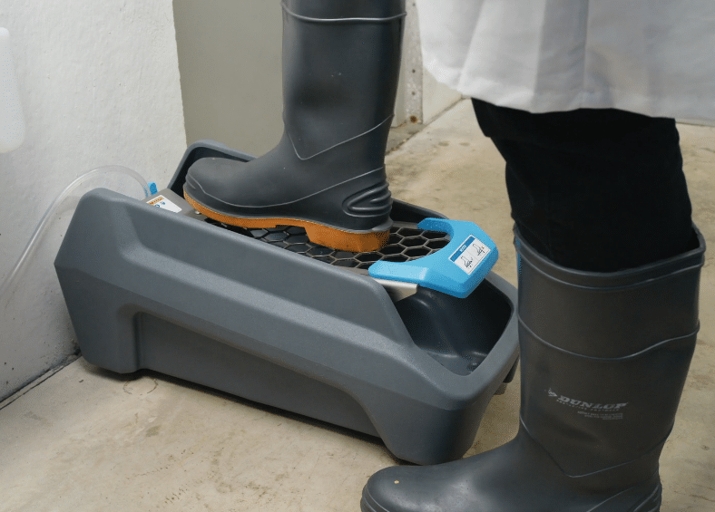 For livestock transition zones, footwear sanitizers apply low-moisture chemistry to reduce cross-contamination risk.